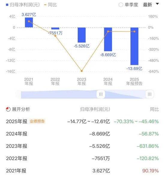 归母净利润更是连续亏损4年。2022年~2024年,分别亏损0.75亿、5.53亿、8.67亿,3年亏损掉14.95亿。到了2025年亏损还在继续扩大,光是前三个季度就亏掉11.1亿,全年更是预亏12.61亿~14.77亿,亏损同比扩大45.46%~70.33%,累计亏损已超26亿。