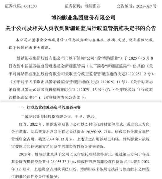 2025年5月,博纳影业发布公告称,公司和董事长于冬、副总裁齐志收到新疆证监局行政监管措施决定书的公告。内容显示,2023年,博纳影业及其子公司以支付信托理财款等形式,通过第三方向于冬及其关联方提供资金共计约2.6亿元,构成控股股东非经营性资金占用。截至2024年12月末,上述资金占用款项已归还。博纳影业未按规定披露与控股股东之间发生的非经营性资金往来情况。