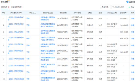 天眼查显示,于冬名下关联企业近50家,但在2025年内,于冬持有的多家公司股权被法院冻结,或被采取财产保全措施,涉及金额超5.66亿元。其中最大的一笔为西藏祥川,被冻结2.78亿股权。